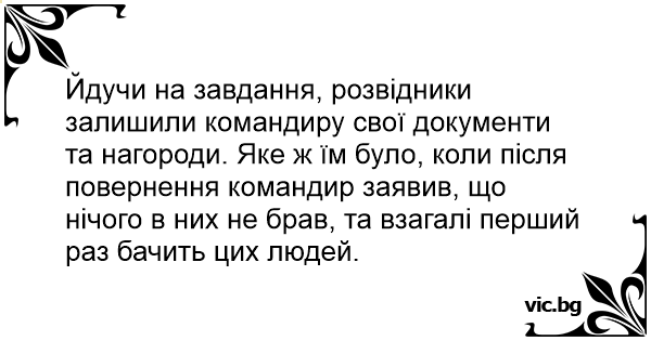 Йдучи на завдання, розвідники залишили командиру свої документи та нагороди. Яке ж їм було, коли після повернення командир заявив, що нічого в них не брав, та взагалі перший раз бачить цих людей.