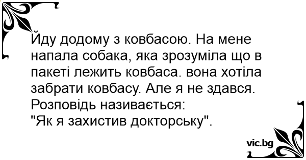 Йду додому з ковбасою. На мене напала собака, яка зрозуміла що в пакеті лежить ковбаса. вона хотіла забрати ковбасу. Але я не здався.