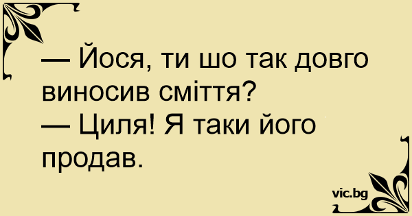 — Мойша! Ти майже дві години виносив сміття! Як так? — Сара, заспокійся! Я його все ж таки продав!