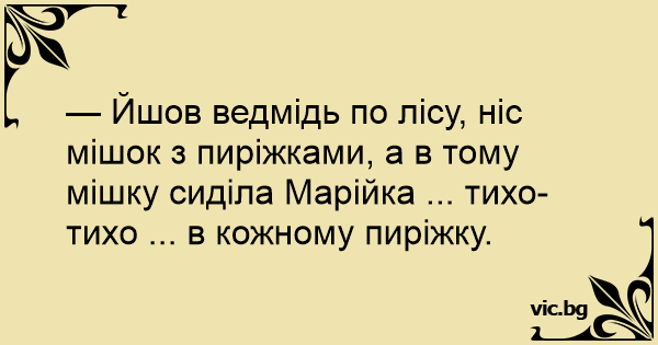 — Йшов ведмідь по лісу, ніс мішок з пиріжками, а в тому мішку сиділа Марійка ... тихо-тихо ... в кожному пиріжку.