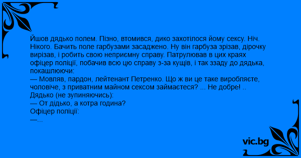 Йшов дядько полем. Пізно, втомився, дико захотілося йому сексу. Ніч. Нікого. Бачить поле гарбузами засаджено. Ну він гарбуза зрізав, дірочку вирізав, і робить свою неприємну справу. Патрулював в цих краях офіцер поліції, побачив всю цю справу з-за кущів, і так ззаду до дядька, покашлюючи: