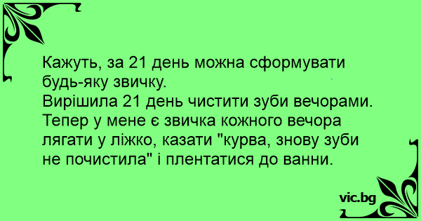 Тепер у мене є звичка кожного вечора лягати у ліжко, казати "kуpba, знову зуби не почистила" і плентатися до ванни.