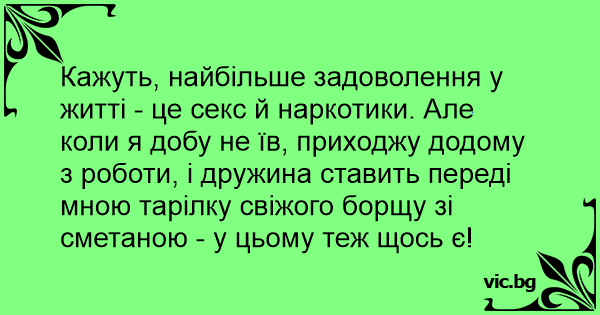 Кажуть, найбільше задоволення у житті - це cekc й наркотики. Але коли я добу не їв, приходжу додому з роботи, і дружина ставить переді мною тарілку свіжого борщу зі сметаною - у цьому теж щось є!