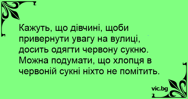 Кажуть, що дівчині, щоби привернути увагу на вулиці, досить одягти червону сукню. Можна подумати, що хлопця в червоній сукні ніхто не помітить.