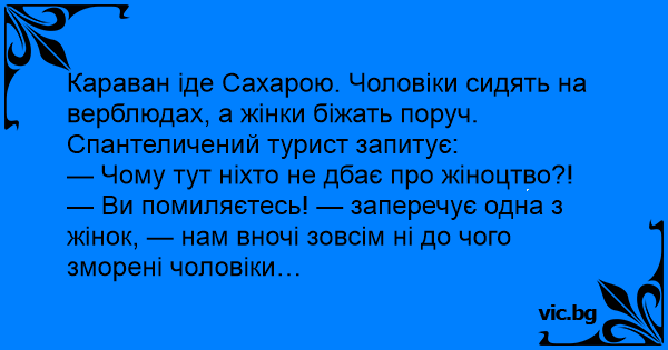 Караван іде Сахарою. Чоловіки сидять на верблюдах, а жінки біжать поруч. Спантеличений турист запитує:
