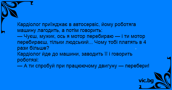 Мъж отишъл в автосервиз за проблеми с двигателя. Заговорил се с монтьора и споменал, че е кардиохирург. В този момнет монтьорът казал: