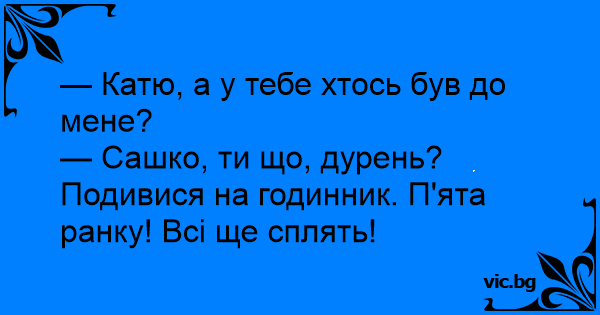 — Сашко, ти що, дурень? Подивися на годинник. П'ята ранку! Всі ще сплять!