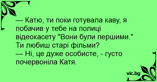 — Катю, ти поки готувала каву, я побачив у тебе на полиці відеокасету "Вони були першими." Ти любиш старі фільми?