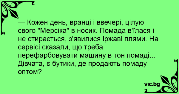 — Кожен день, вранці і ввечері, цілую свого "Мерсіка" в носик. Помада в'їлася і не стирається, з'явилися іржаві плями. На сервісі сказали, що треба перефарбовувати машину в тон помаді... Дівчата, є бутики, де продають помаду оптом?