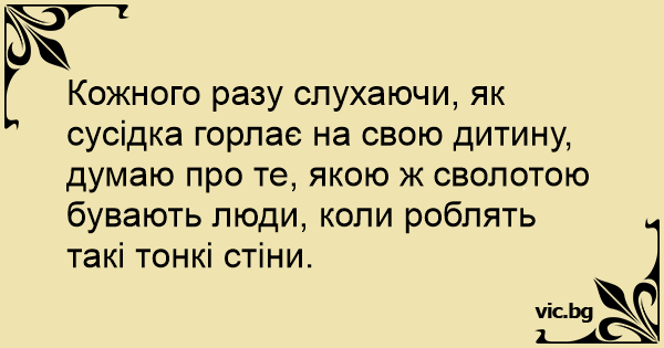 Кожного разу слухаючи, як сусідка горлає на свою дитину, думаю про те, якою ж сволотою бувають люди, коли роблять такі тонкі стіни.