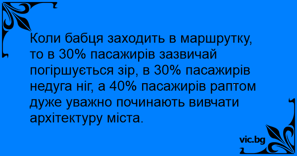 Коли бабця заходить в маршрутку, то в 30% пасажирів зазвичай погіршується зір, в 30% пасажирів недуга ніг, а 40% пасажирів раптом дуже уважно починають вивчати архітектуру міста.