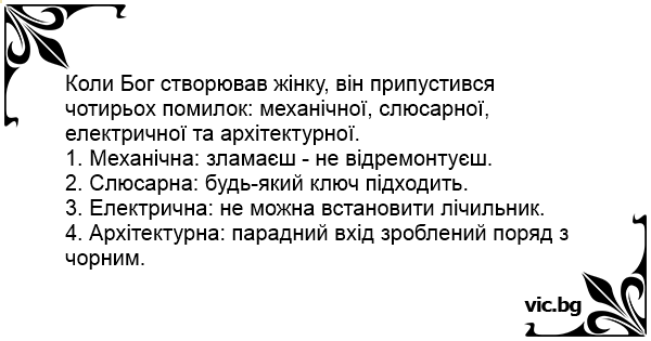 Коли Бог створював жінку, він припустився чотирьох помилок: механічної, слюсарної, електричної та архітектурної.
