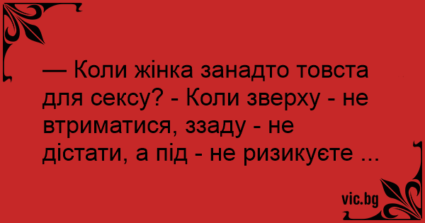 — Коли жінка занадто товста для сексу? - Коли зверху - не втриматися, ззаду - не дістати, а під - не ризикуєте ...