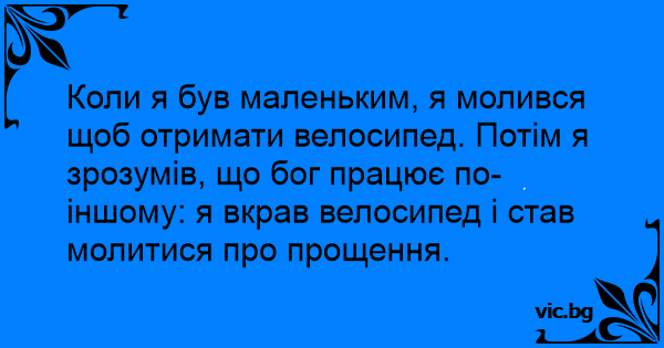 Коли я був маленьким, я молився щоб отримати велосипед. Потім я зрозумів, що бог працює по-іншому: я вкрав велосипед і став молитися про прощення.