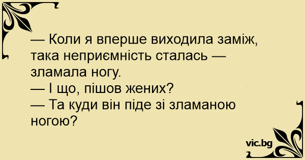 — Коли я вперше виходила заміж, така неприємність сталась — зламала ногу.