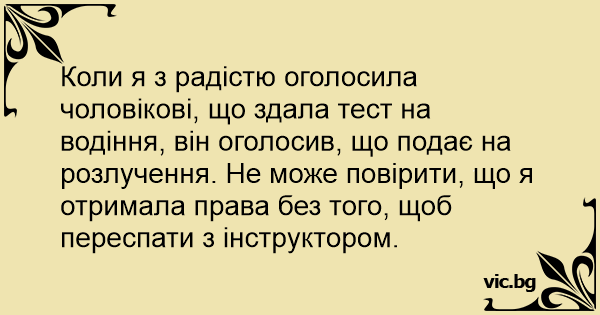 Като казах на мъжа ми, че съм взела шофьорска книжка, той ми каза че иска развод. Не може да повярва, че съм взела, без да съм спала с инструктора