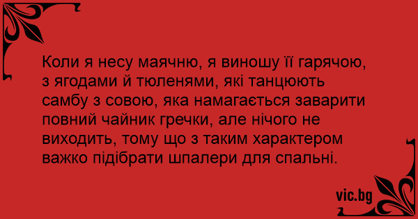 Коли я несу маячню, я виношу її гарячою, з ягодами й тюленями, які танцюють самбу з совою, яка намагається заварити повний чайник гречки, але нічого не виходить, тому що з таким характером важко підібрати шпалери для спальні.