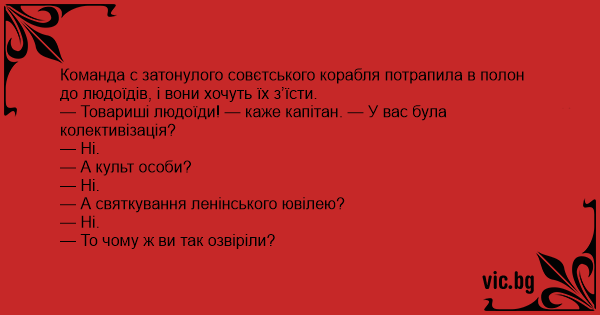 — Товариші людоїди! — каже капітан. — У вас була колективізація?