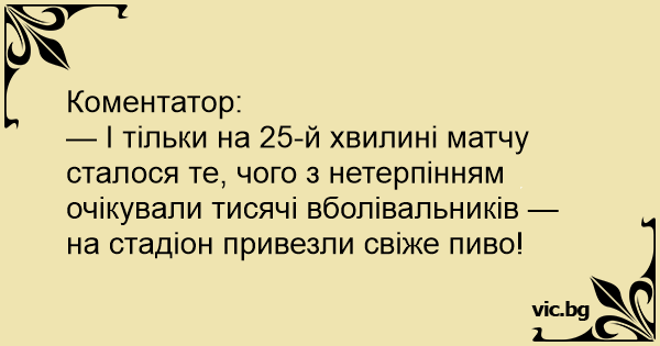 Коментатор: — І тільки на 25-й хвилині матчу сталося те, чого з нетерпінням очікували тисячі вболівальників — на стадіон привезли свіже пиво!