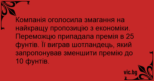 Компанія оголосила змагання на найкращу пропозицію з економіки. Переможцю припадала премія в 25 фунтів. Її виграв шотландець, який запропонував зменшити премію до 10 фунтів.