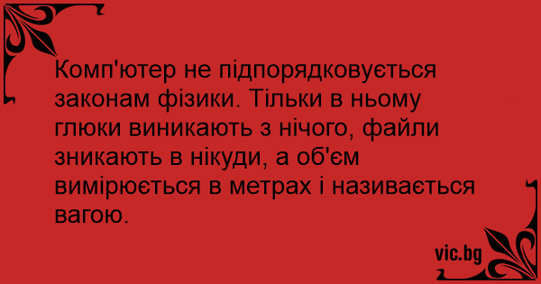 Комп'ютер не підпорядковується законам фізики. Тільки в ньому глюки виникають з нічого, файли зникають в нікуди, а об'єм вимірюється в метрах і називається вагою.