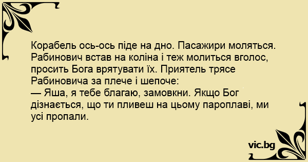 Корабель ось-ось піде на дно. Пасажири моляться. Рабинович встав на коліна і теж молиться вголос, просить Бога врятувати їх. Приятель трясе Рабиновича за плече і шепоче:
