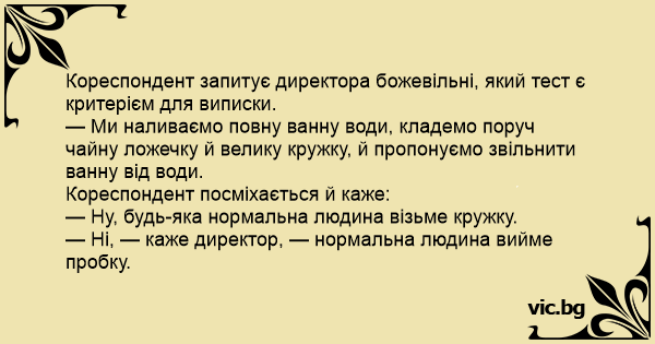 Кореспондент запитує директора божевільні, який тест є критерієм для виписки.