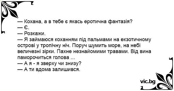 — Я займаюся коханням під пальмами на екзотичному острові у тропічну ніч. Поруч шумить море, на небі величезні зірки. Пахне незнайомими травами. Від вина паморочиться голова ...