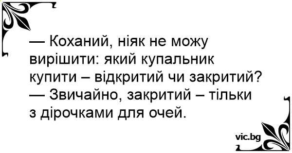 — Коханий, ніяк не можу вирішити: який купальник купити – відкритий чи закритий?
