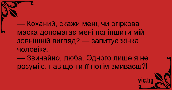 — Коханий, скажи мені, чи огіркова маска допомагає мені поліпшити мій зовнішній вигляд? — запитує жінка чоловіка.