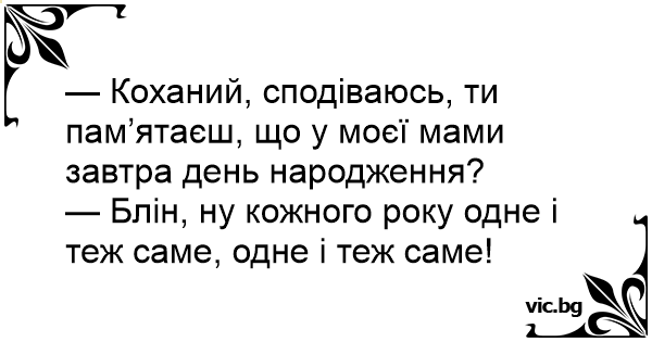 — Коханий, сподіваюсь, ти пам’ятаєш, що у моєї мами завтра день народження?