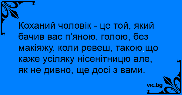 Коханий чоловік - це той, який бачив вас п'яною, голою, без макіяжу, коли ревеш, такою що каже усіляку нісенітницю але, як не дивно, ще досі з вами.