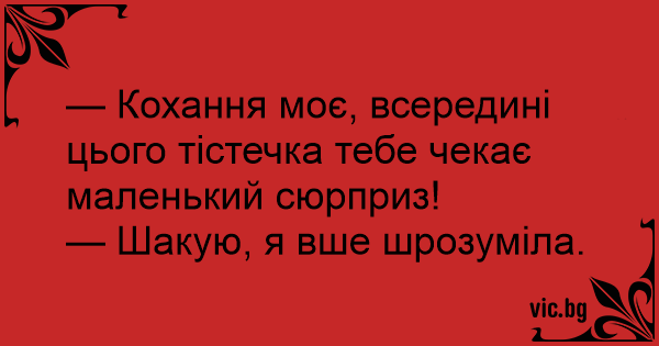 — Кохання моє, всередині цього тістечка тебе чекає маленький сюрприз!