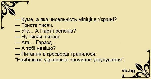 — Куме, а яка чисельність міліції в Україні?