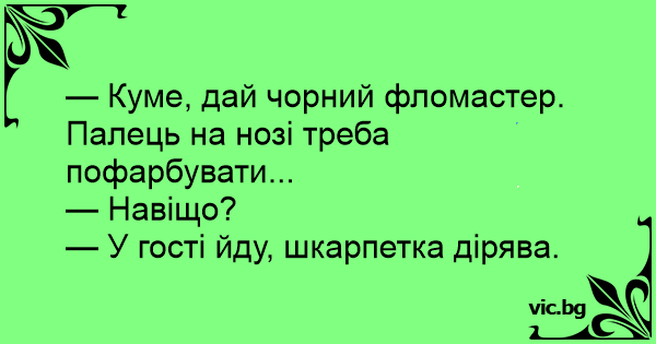 — Куме, дай чорний фломастер. Палець на нозі треба пофарбувати...