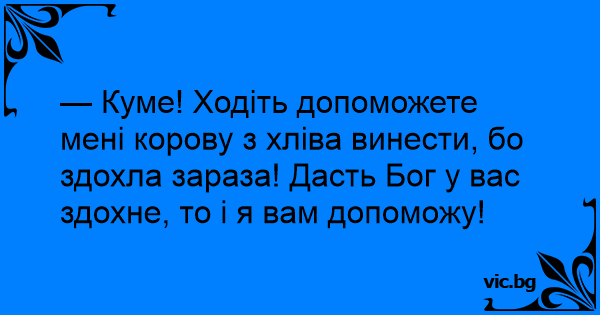 — Куме! Ходіть допоможете мені корову з хліва винести, бо здохла зараза! Дасть Бог у вас здохне, то і я вам допоможу!