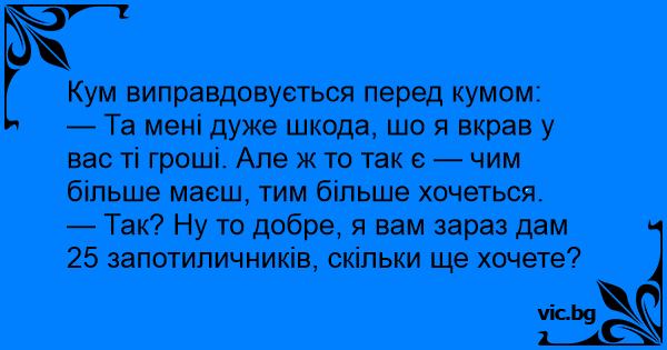 — Та мені дуже шкода, шо я вкрав у вас ті гроші. Але ж то так є — чим більше маєш, тим більше хочеться.