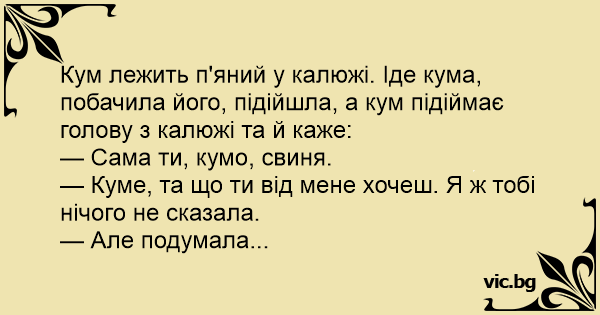 Кум лежить п'яний у калюжі. Іде кума, побачила його, підійшла, а кум підіймає голову з калюжі та й каже: