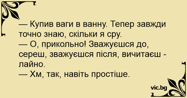 — Купив ваги в ванну. Тепер завжди точно знаю, скільки я сру.