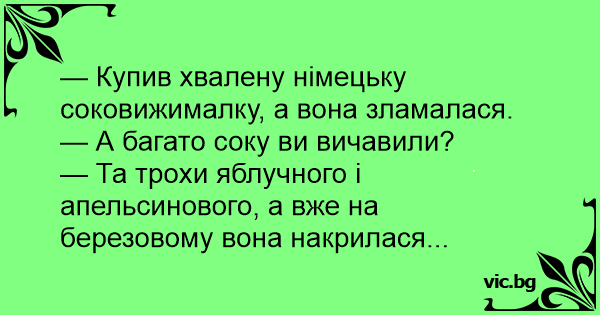 — Купив хвалену німецьку соковижималку, а вона зламалася.<br />— А багато соку ви вичавили?<br />— Та трохи яблучного і апельсинового, а вже на березовому вона накрилася...