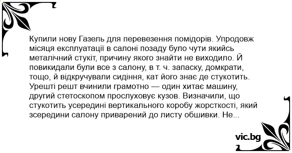 Купили нову Газель для перевезення помідорів. Упродовж місяця експлуатації в салоні позаду було чути якийсь металічний стукіт, причину якого знайти не виходило. Й повикидали були все з салону, в т. ч. запаску, домкрати, тощо, й відкручували сидіння, кат його знає де стукотить. Урешті решт вчинили грамотно — один хитає машину, другий стетоскопом прослуховує кузов. Визначили, що стукотить усередині вертикального коробу жорсткості, який зсередини салону приварений до листу обшивки. Не полінились, вирізали болгаркою дірку. Усередині коробу на грубій лесі висить гайка М24 й записка московською мовою "МОЛОДЕЦ, НАШЕЛ".
