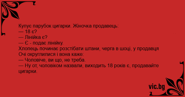 — Ну от, чоловіком назвали, виходить 18 років є, продавайте цигарки.