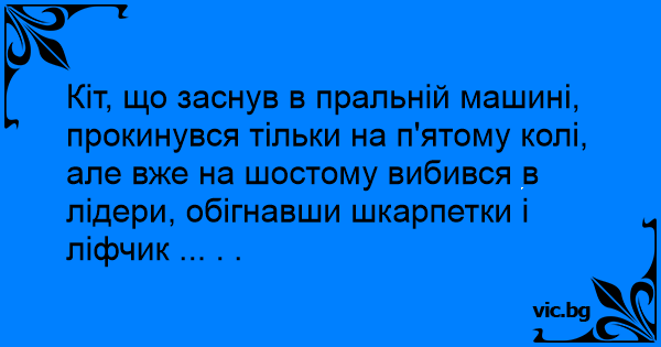 Кіт, що заснув в пральній машині, прокинувся тільки на п'ятому колі, але вже на шостому вибився в лідери, обігнавши шкарпетки і ліфчик ... . .