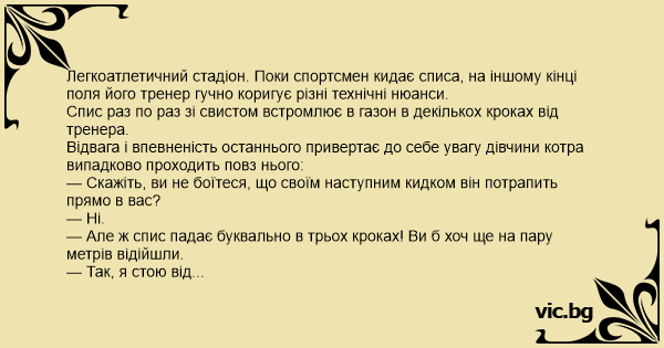 Легкоатлетичний стадіон. Поки спортсмен кидає списа, на іншому кінці поля його тренер гучно коригує різні технічні нюанси.