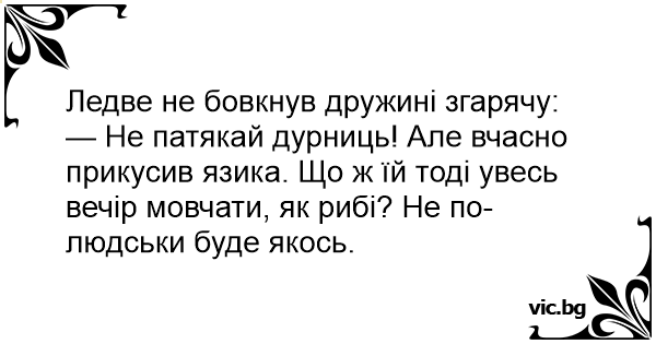 — Не патякай дурниць! Але вчасно прикусив язика. Що ж їй тоді увесь вечір мовчати, як рибі? Не по-людськи буде якось.