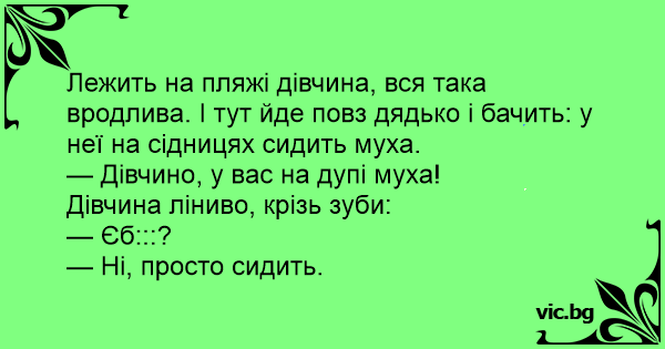 Лежить на пляжі дівчина, вся така вродлива. І тут йде повз дядько і бачить: у неї на сідницях сидить муха.