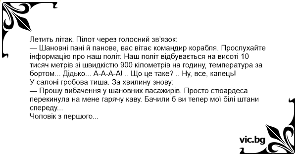 — Шановні пані й панове, вас вітає командир корабля. Прослухайте інформацію про наш політ. Наш політ відбувається на висоті 10 тисяч метрів зі швидкістю 900 кілометрів на годину, температура за бортом... Дідько... А-А-А-А! .. Що це таке? .. Ну, все, капець!