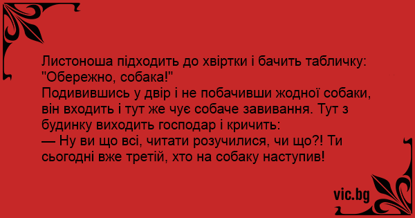 — Ну ви що всі, читати розучилися, чи що?! Ти сьогодні вже третій, хто на собаку наступив!