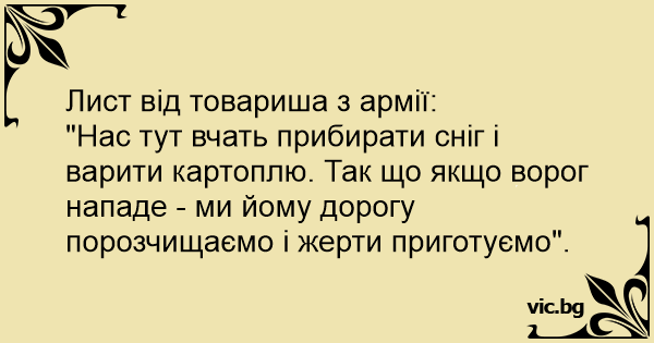 "Нас тут вчать прибирати сніг і варити картоплю. Так що якщо ворог нападе - ми йому дорогу порозчищаємо і жерти приготуємо".