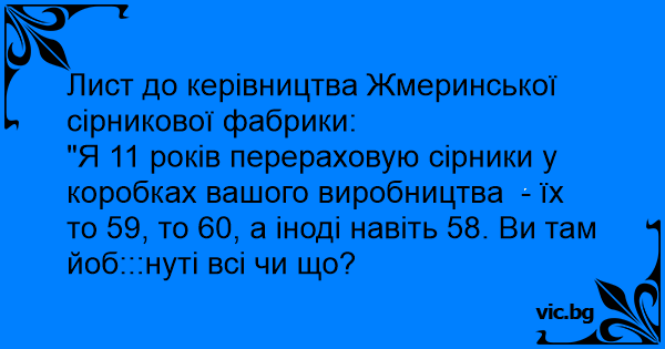 "Я 11 років перераховую сірники у коробках вашого виробництва - їх то 59, то 60, а іноді навіть 58. Ви там йоб:::нуті всі чи що?